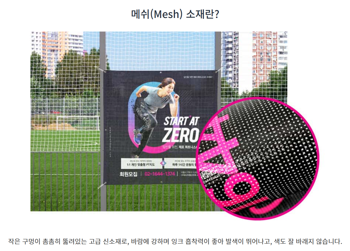 - 메쉬천 재질로 비바람/햇빛에도 잉크가 번지거나, 색이 바래지 않아 장기간 사용이 가능해요.