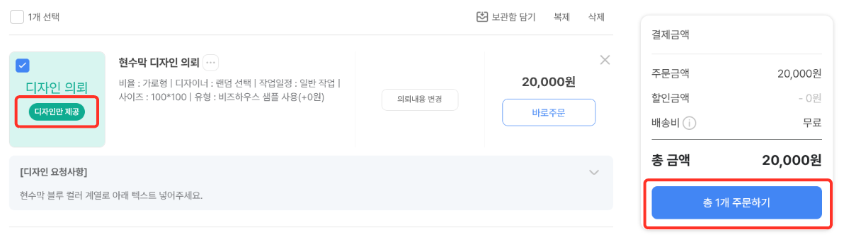 🔍 참고해 주세요! 👉 디자인 의뢰 상품은 디자인 의뢰 건만 묶어 주문이 가능합니다. ex) 디자인 의뢰 상품 + 디자인 의뢰 상품 = 주문 가능 ex) 디자인 의뢰 상품 + 일반 상품 제작 상품 = 주문 불가능 👉 결제가 한 번에 처리되어야 하는 관공서, 기업일 경우에 적합합니다. 👉 옵션이 달라질 경우 재결제가 필요하므로 옵션을 명확하게 선택하여 신청해 주세요. |