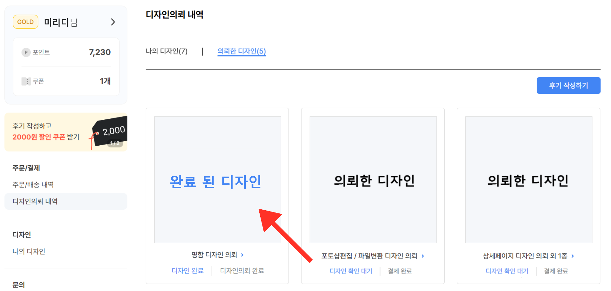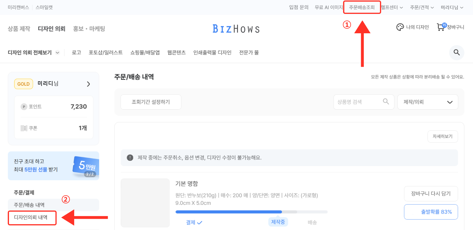 | ① 비즈하우스 주문배송조회 → 의뢰한 디자인을 클릭하여, 완료된 디자인을 선택합니다. |
