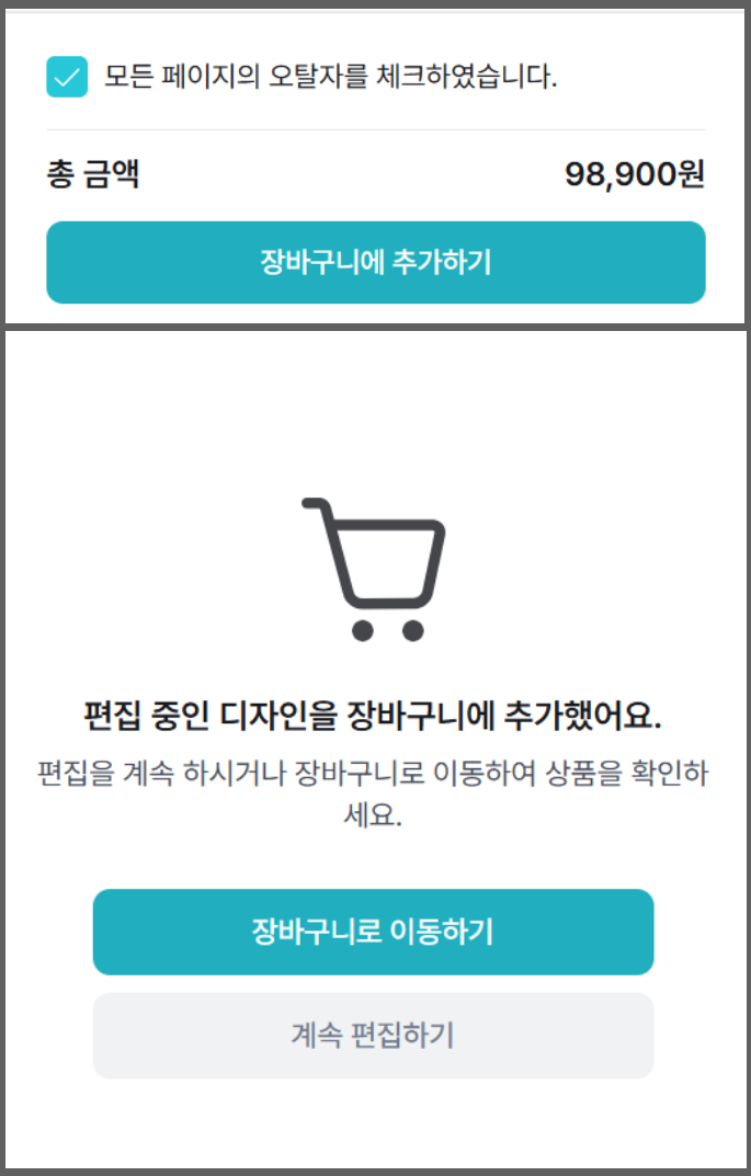 ⑨ 상품 옵션 적용 후 → 디자인 최종 확인 후, 필수 확인 체크 및 장바구니에 추가하기 클릭 ⑩ 최종적으로 장바구니로 이동하여 적용된 디자인을 결제 진행해 주시면 주문 완료 됩니다. | |