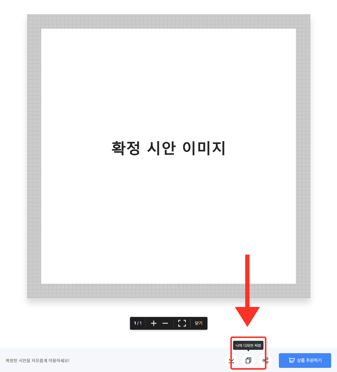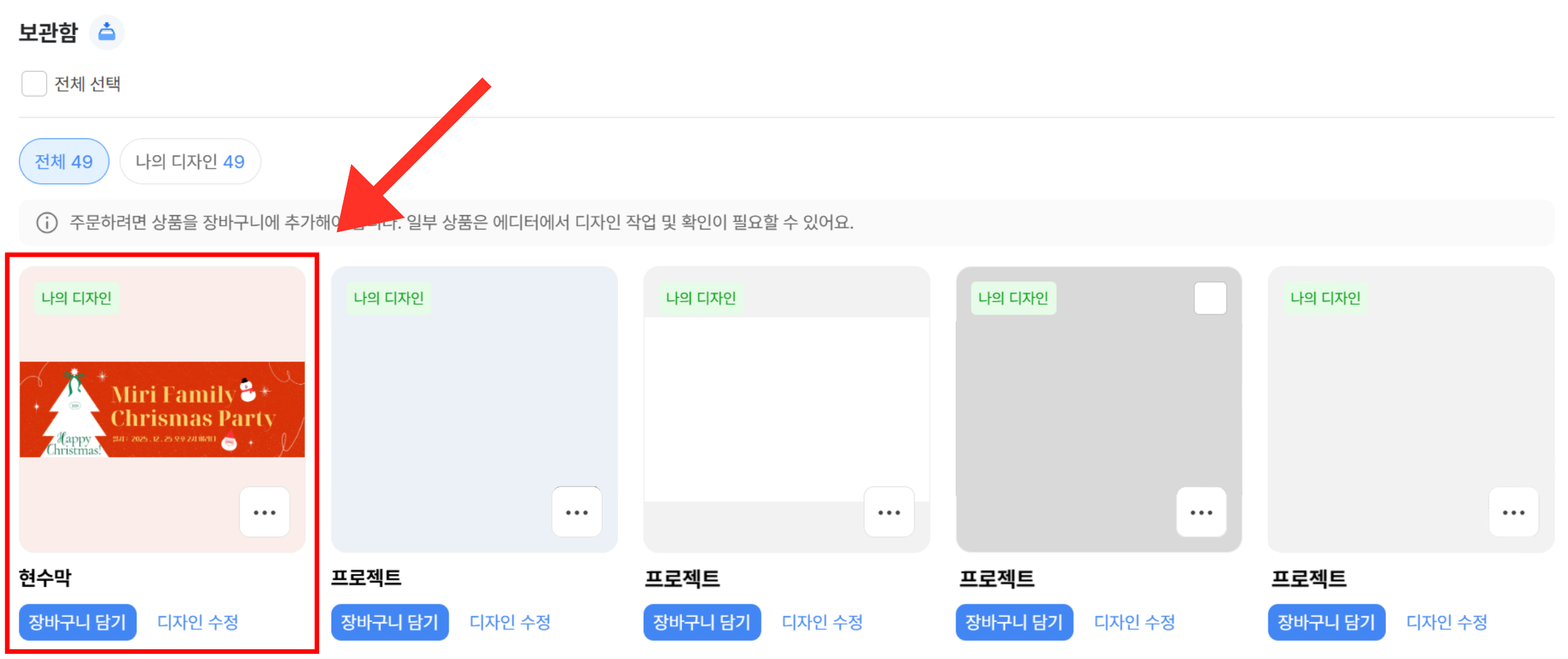 | ③ 장바구니 하단 보관함에 디자인이 저장되었는지 확인해 주세요. |