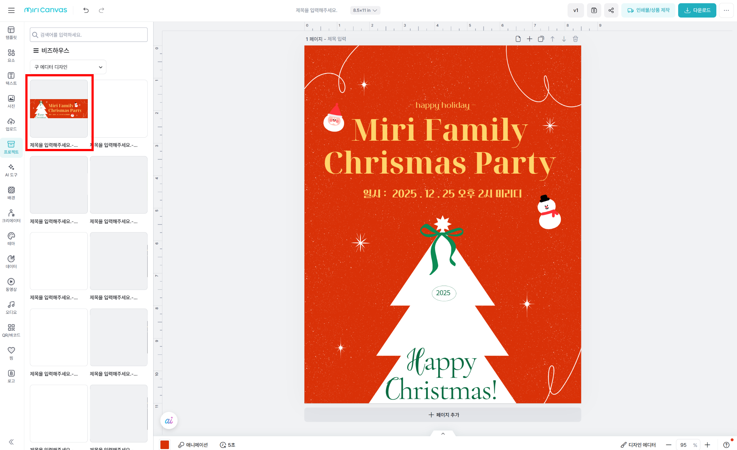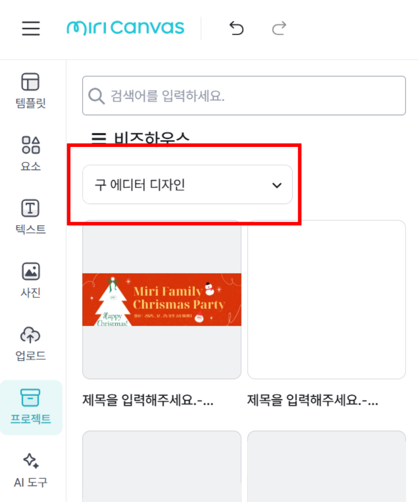 ⑥ 왼쪽 카테고리에서 '프로젝트' 선택 → 비즈하우스 선택 → 구 에디터 디자인 선택하여 디자인 불러오기 🔥기존 디자인 에디터에서 왼쪽 상단에 새로운 에디터가 있는 경우, 새로운 에디터 디자인 (새 에디터) 클릭 | |