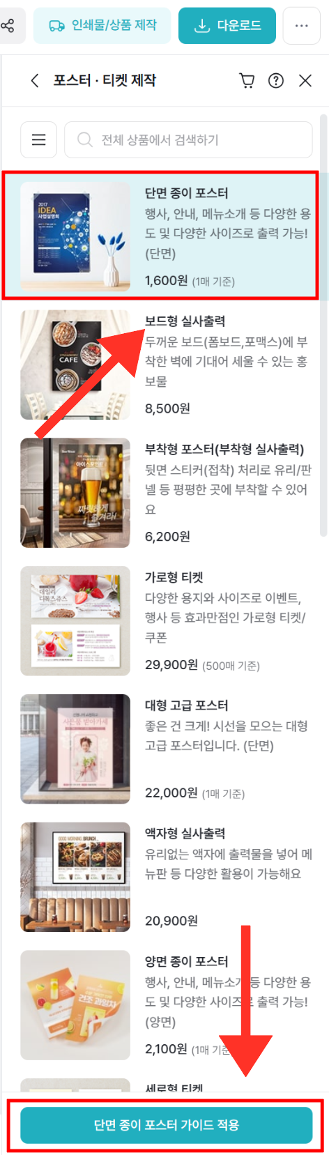 | ⑧ 오른쪽 상단 인쇄물/상품 제작 버튼 클릭 → 원하는 상품 클릭 → 상품 가이드 적용 클릭 | |