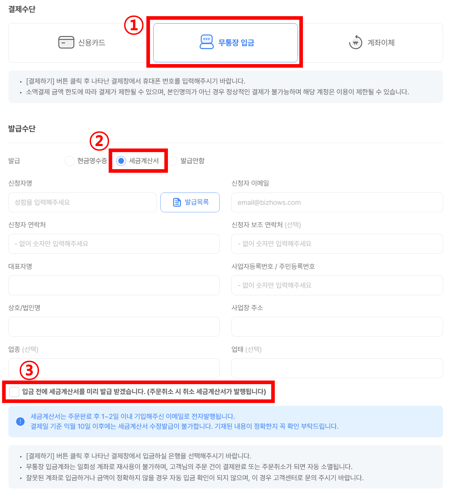 결제 수단에서 [ 무통장 입금 ]을 선택 후 발급 정보 기재 후 [ 입금 전에 세금계산서를 미리 발급 받겠습니다. ]를 체크해 주세요.