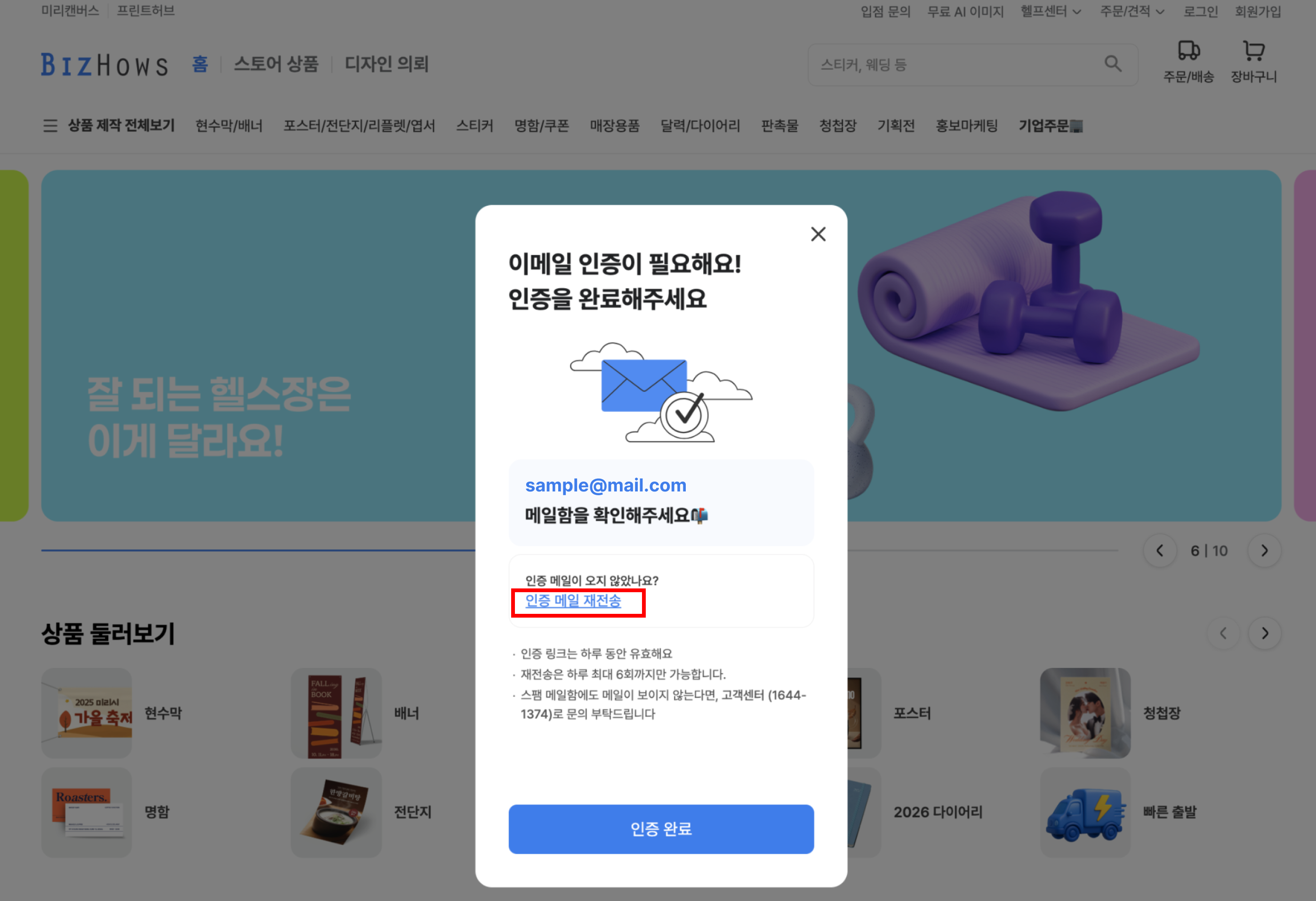 3. 이메일 인증 안내 다이얼로그에서 [인증메일 재전송] 클릭