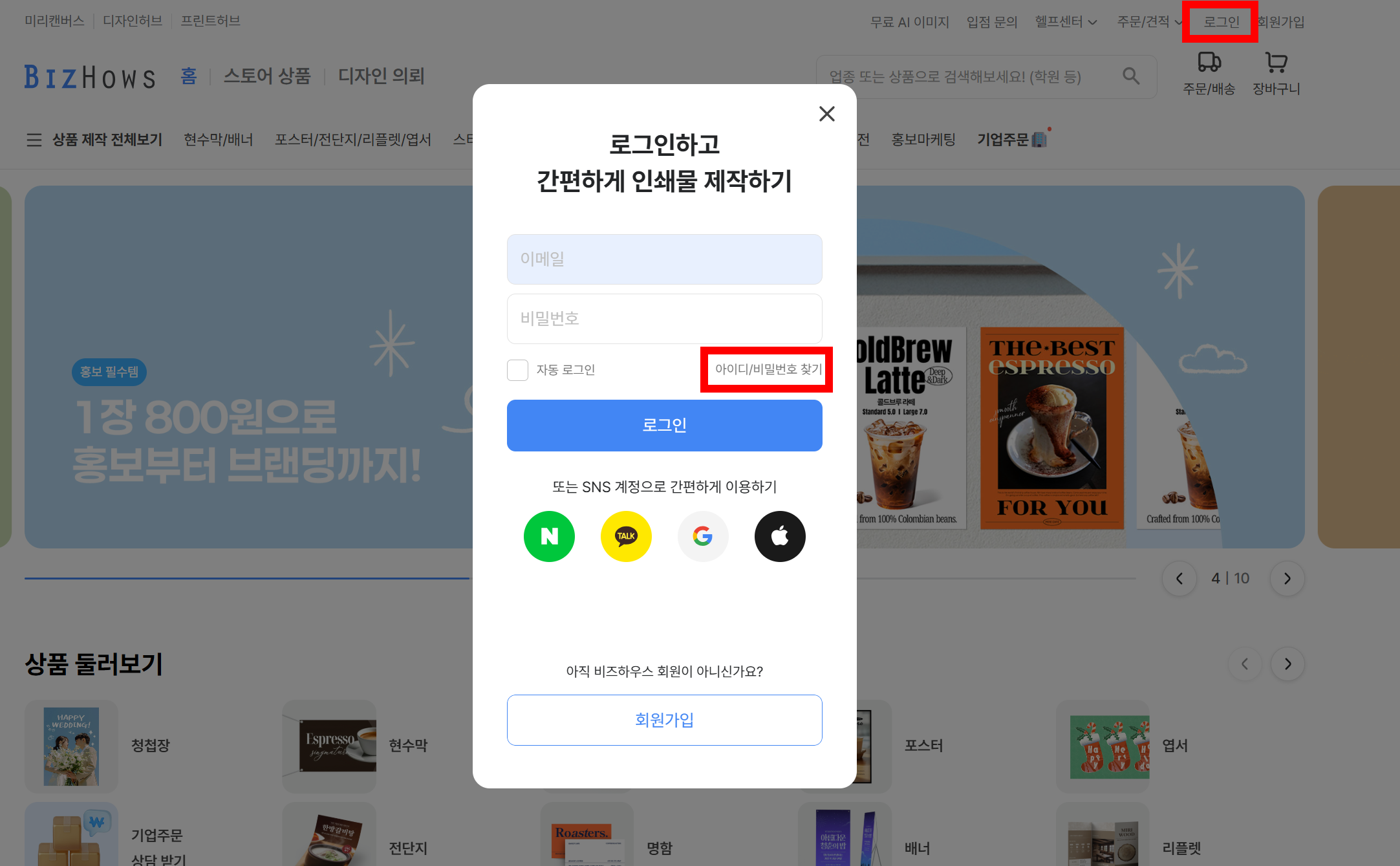 네이버, 카카오 등 SNS 연동 계정으로 가입하신 경우 비즈하우스가 아닌 해당 소셜 사이트의 로그인 정보를 그대로 사용합니다.