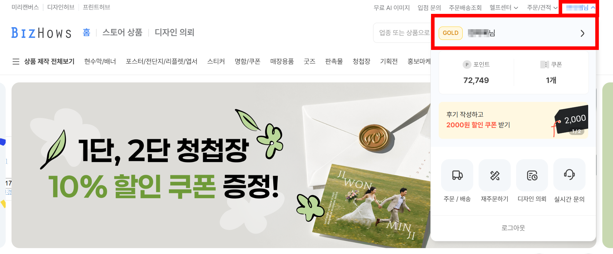 홈페이지 우측 상단의 회원명을 클릭한 뒤, 한 번 더 회원명을 클릭하시면 내 정보 수정 페이지로 이동할 수 있습니다.