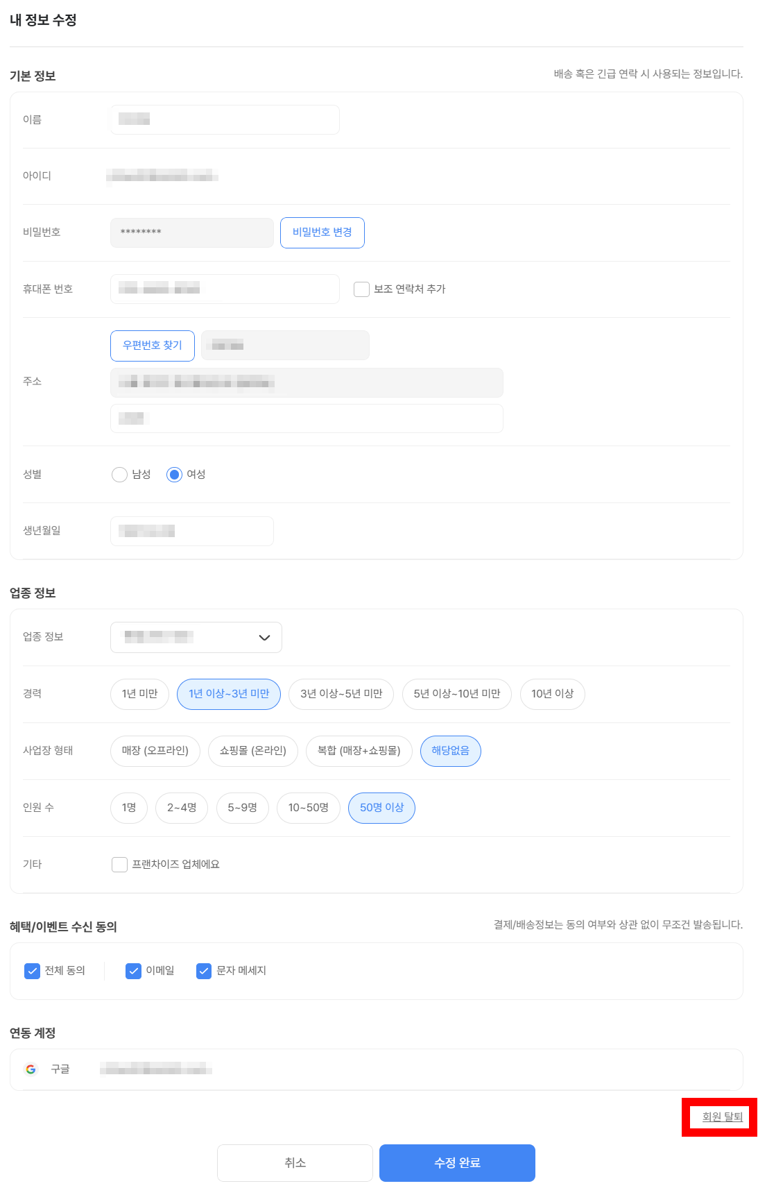 회원 탈퇴는 내 정보 수정 페이지 우측 최하단의 [회원탈퇴] 버튼을 통해 진행해 주세요.